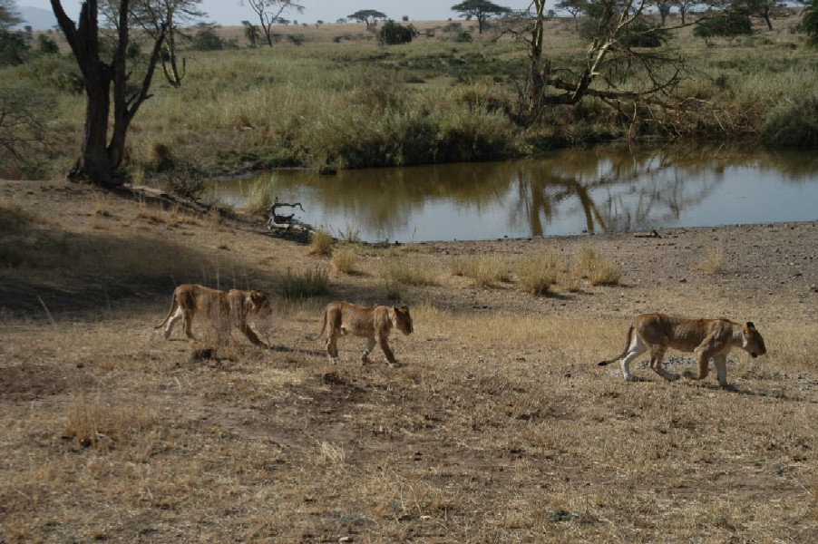 As we pulled up the road, not far from a river, we spotted a small lioness trot casually past our truck. Under the shade of a large Acacia tree there was a large group lions taking rest, many had faint spots on their fur indicating they were still cubs. One by one they jogged past the growing row of vehicles parked on the road. They seemed almost oblivious to us as they carried out their covert operation, moving swiftly through the open area, pausing behind another tree and then disappearing in some tall grass. Almost as entertaining as the lions were all of the cars of tourist trying to take photos. Lined up along the road there were cars stretched in both directions. I spotted one guy sitting on top of his safari roof, shirt off, a animal tooth necklace dangling down his chest, a large beaded Maasai bracelet, a safari hat and a two foot long telephone lens. Sisti maneuvered the truck forward to get a better look at where the lions were now positioned. Across the street stood three perfected erect giraffe that had positioned themselves into a kind of defensive triangle to keep watch in all directions. We could see the heads of the lions peeking out above the grass, looking towards the giraffe. The giraffe were looking right back. It was a standoff. After observing this defensive gridlock for a while we finally moved on in search of other viewing.