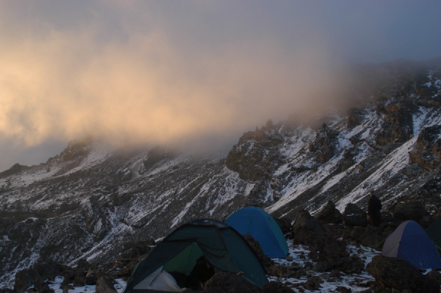 August 27. MT. KILIMANJARO - Day Five - THE BIG CLIMB I had been well awake since before 11:00. By the time 12:30 rolled around I started to feel anxious to get moving. I hadn't exactly slept much since we arrived at the campsite but I was feeling well rested. Most of the other groups had already started towards the summit and I could see a trail of lights zigzagging up the mountain. It was an exceptionally clear night and with a three-quarter full moon the sky was quite bright. The weather had calmed the wind was still. Aside from the snow that fell earlier in the evening I couldn't have asked for better conditions.