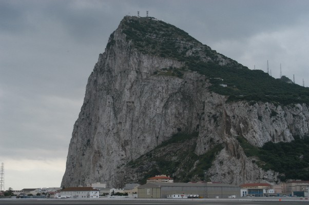 April 29. GIBRALTAR We could see the big rock from Algeciras, looking a bit like the shape of a person lying down. The Greeks thought it was one of the pillars of Hercules with its sister pillar positioned on the coast of Morocco, together marking the edge of the known world. The Phoenicians sailed past the "edge of the known world" and also left their traces on Gibraltar. But it was from the leader of the Muslim invasion of the Iberian peninsula in 711 that the island received its name. Gibraltar was derived from Jebel Tariq, meaning Tariq's mountain, after the Muslim leader Tariq ibn Ziyad.