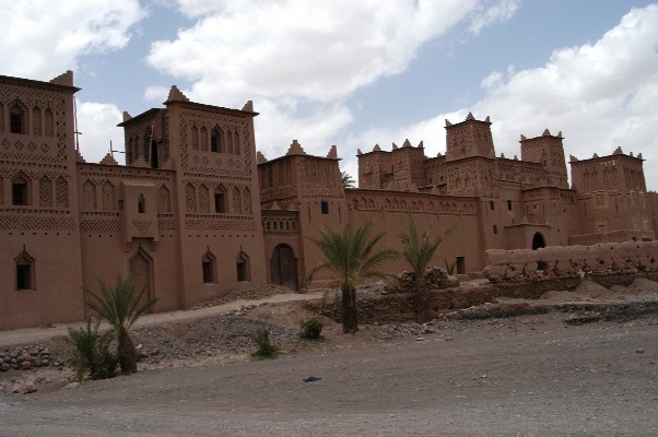 May 13. BOUMALNE DADES - SKOURA "Meet us at the Kasbah" We left the hotel for breakfast and found a decent place in Boulmane's small downtown. A man dressed in a bright blue Tuareg robe approached us eagerly to propose a ride the gorge. He had people already waiting to leave. Uh huh. We sat down for breakfast and pondered what to do. The public transport options in the guidebook referenced sporadic buses to the Dades Gorge towns, mostly tied to the sequential market days. At that pace it would take days or even a week to get up and back. That reality combined with the photos we had seen of the gorge made us reconsider the whole idea. Without sounding like I am belittling what was certainly a scenic gorge, we had had the benefit of some spectacular desert scenery in Jordan not that long ago and felt that it was better to spend the money on something unique to our experience in Morocco. We had opted not to see the sand dunes for the same reason. Having seen more remote dunes in China last year made us less eager to visit Morocco's much more tourist developed area. We heard good reviews of the gorge and the dunes but, for us, the kasbahs were something really unique to Morocco and not far up the highway was Kasbah Ben Moro Hotel, a renovated 18th century kasbah that had been turned into a hotel.